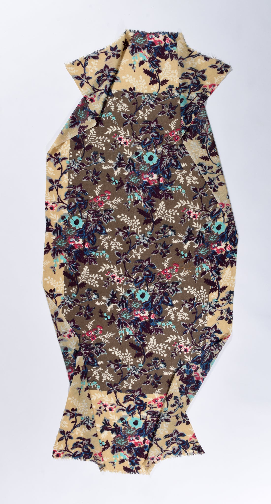 Épice Schal mit floralen Muster in der Grundfarbe Walnuss. Jedes Stück von Hand gewebt und gefärbt. Schmückt den Mantel, das Kleid oder einen schlichten Pullover wie ein kleines Kunstwerk.