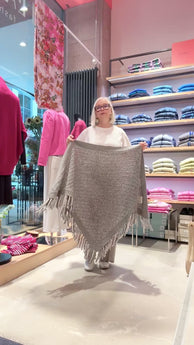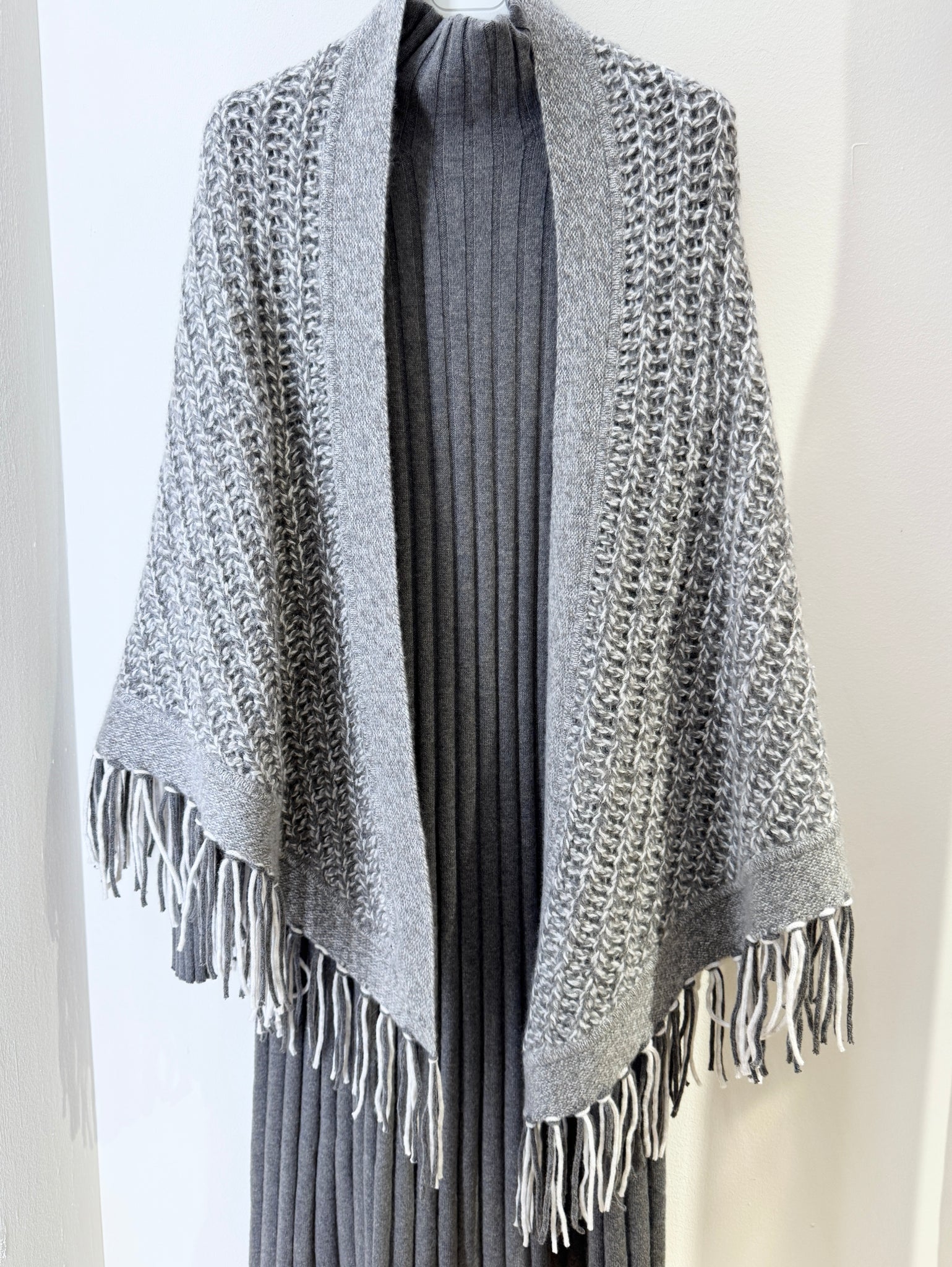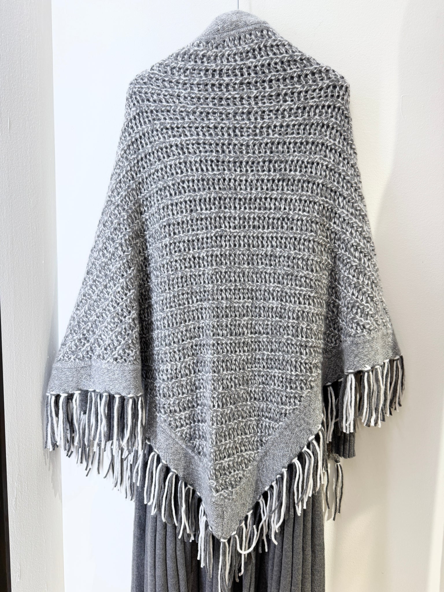 Dreieckstuch/Cape in Grobstrick mit Franzen und Lurexfaden in Silber.