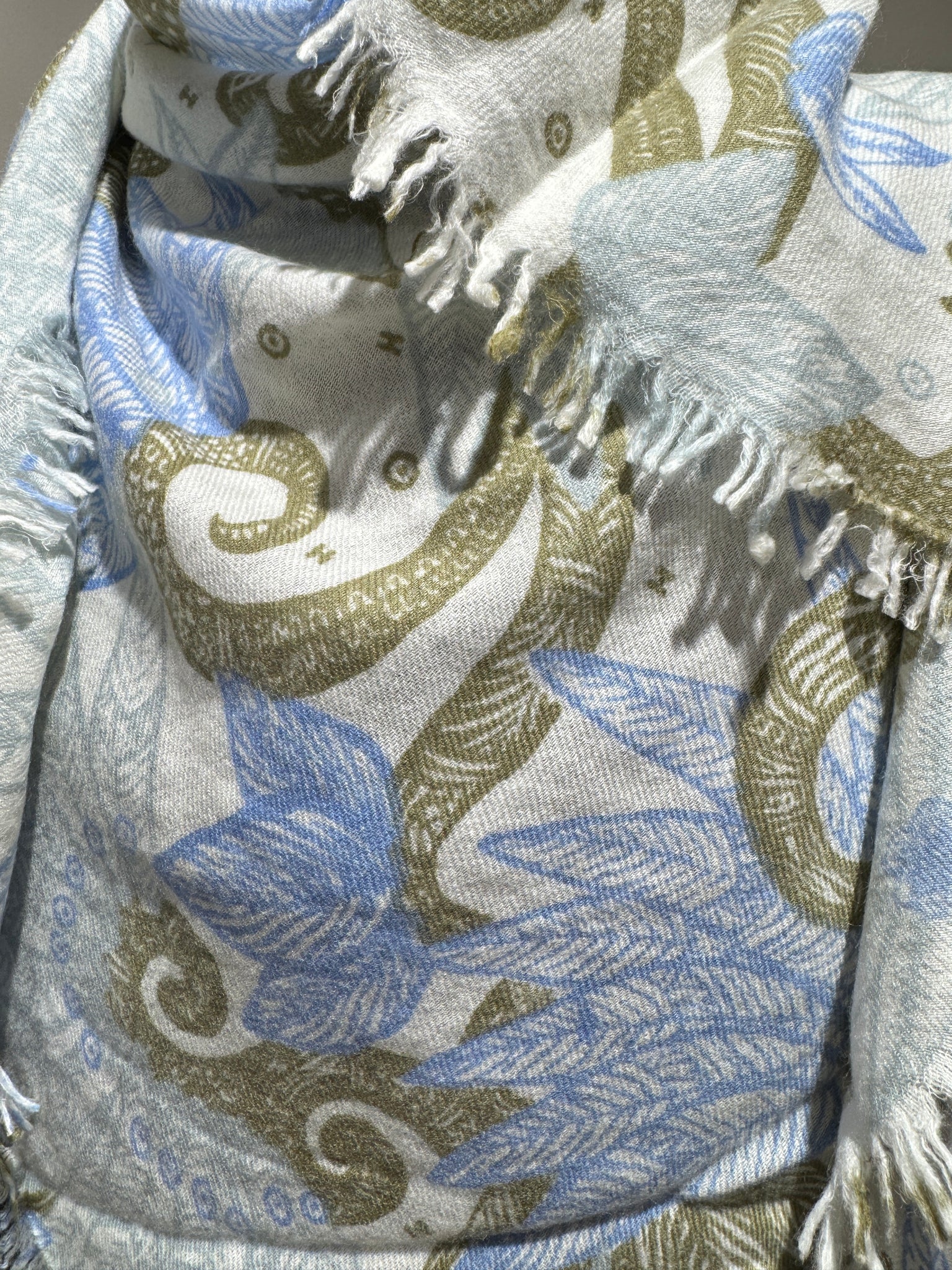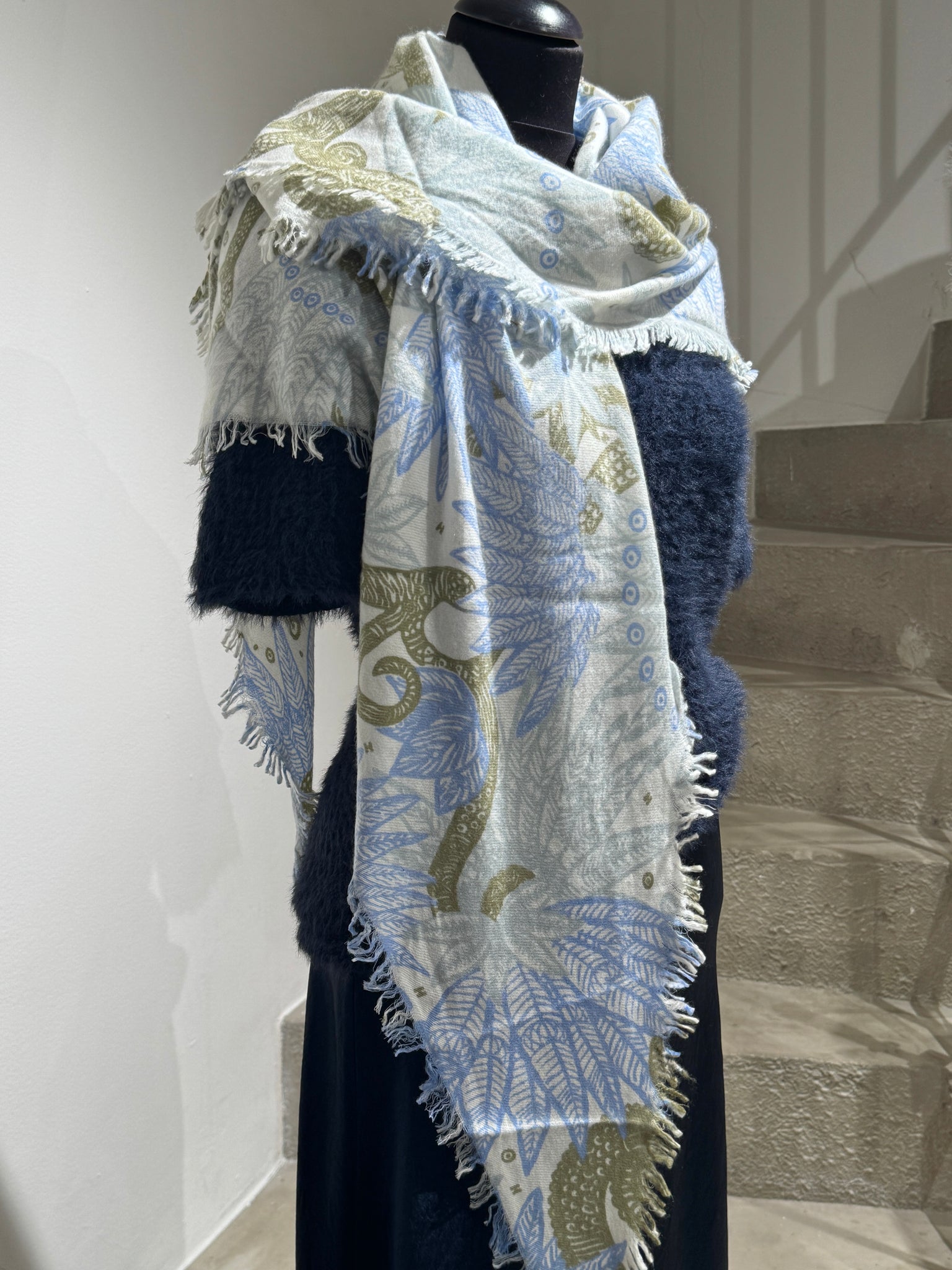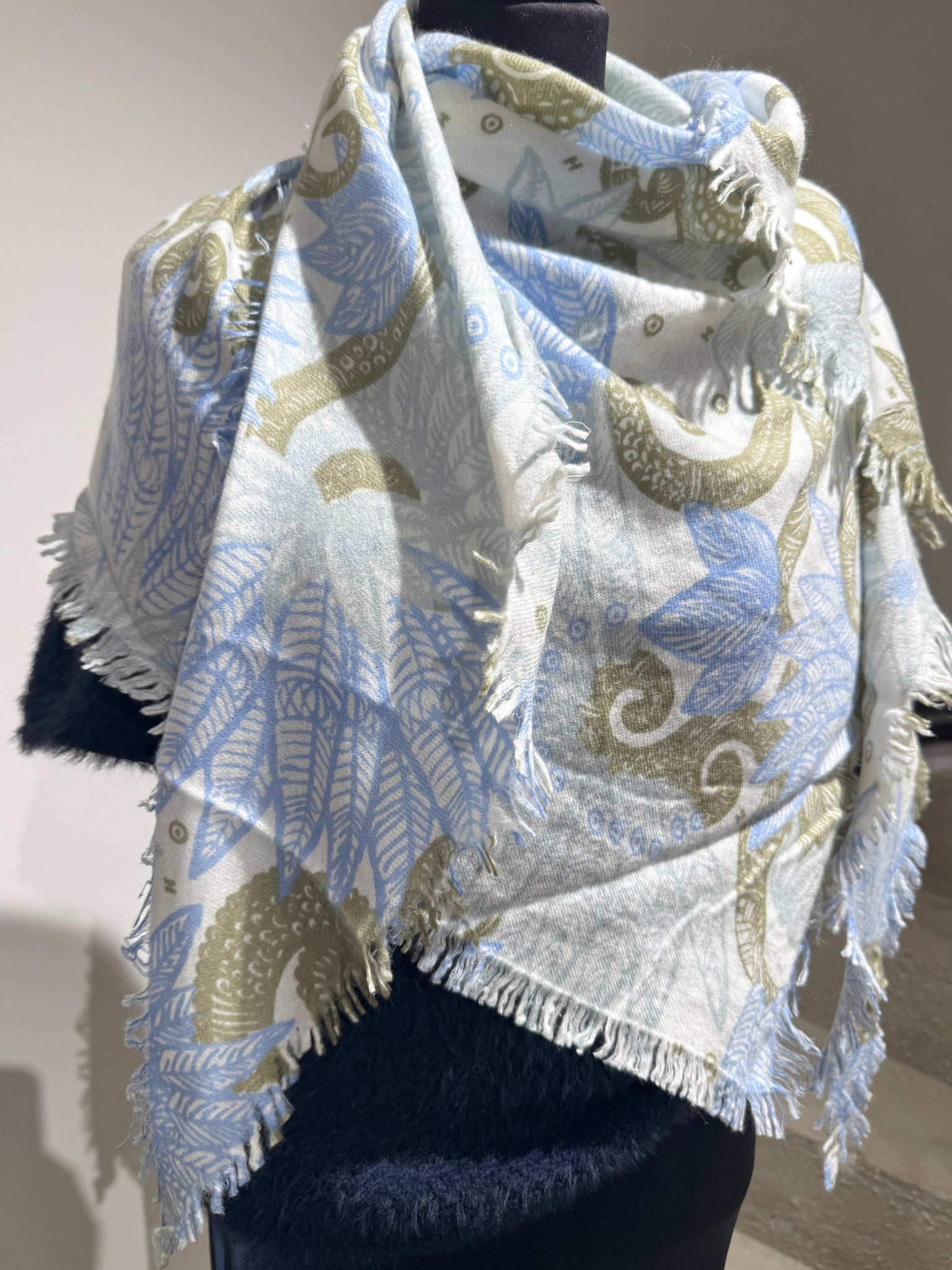 Farbe: Wollweiss, Oliv und Jeansblau