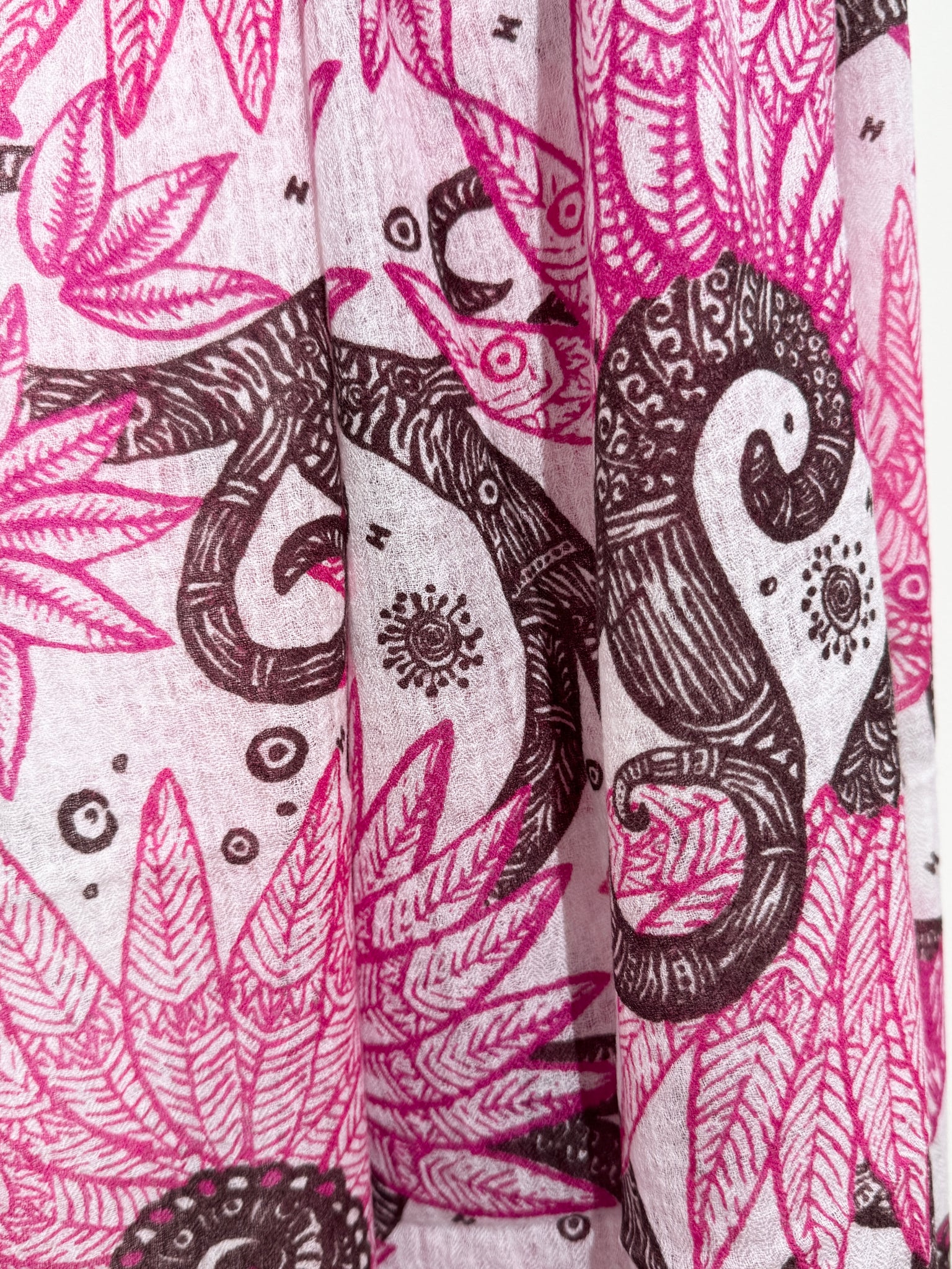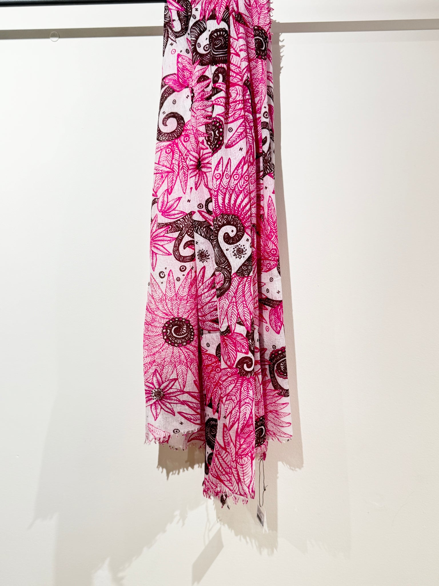 Hemisphere Schal in 100% Wolle. Leicht transparent und mit Franzen. Jungle Print.